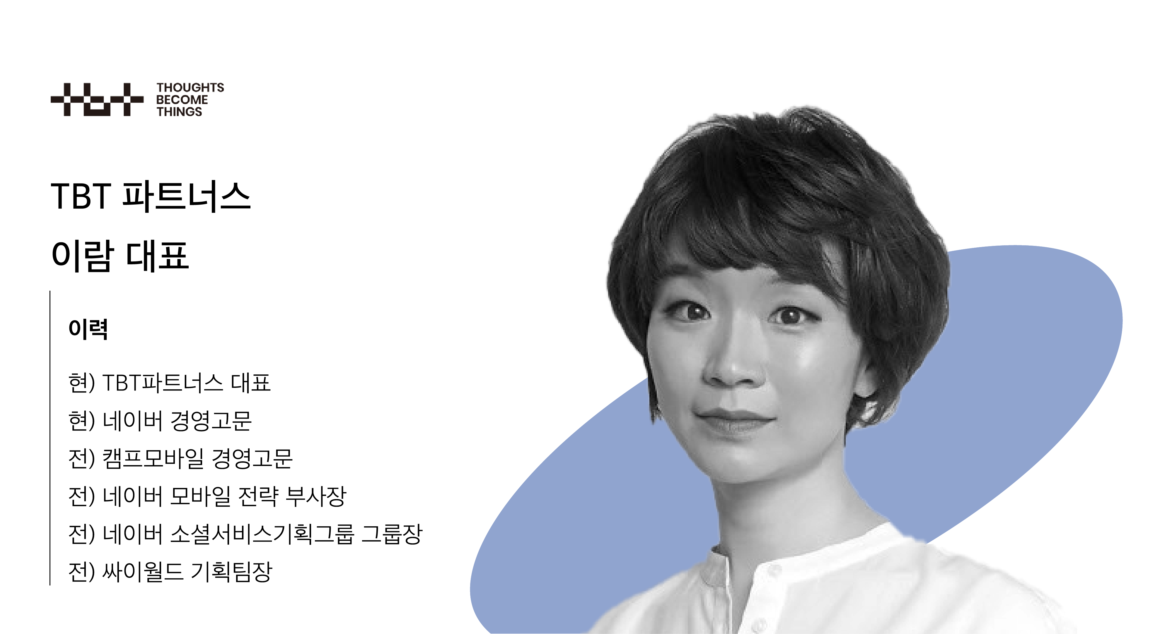 이제는 향후 20년을 이끌어 갈 새로운 주인공들과 전세계를 무대로 맹활약할 꿈이 큰 서비스를 만나고 싶습니다. 냉철한 분석과 인사이트로 옳은 방향을 조언하고, 아이디어가 필요할 땐 격 없이 디스커션할 수 있는 파트너, 겁없이 도전하는 미래의 주연들을 위해 이람 대표와 TBT는 든든한 조연이 되고자 합니다.